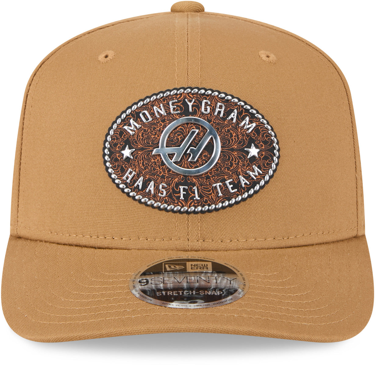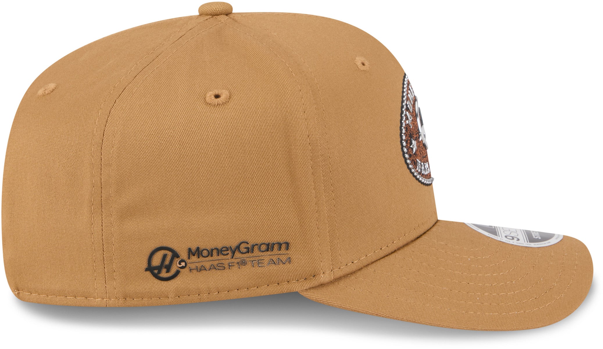 Moneygram Haas F1 New Era 9Seventy Austin GP Race Special Stretch Snapback Cap. Official Moneygram Haas F1 Race and Driver Special Merchandise. Stretch Comfort Fit, with a structured Crown, and the Pre-curved Visor. Wheat colour, with the Moneygram Haas F1 Team Logo, the New Era Flag and Team Sponsor side logo, and the Pre Curved Visor, with th...
