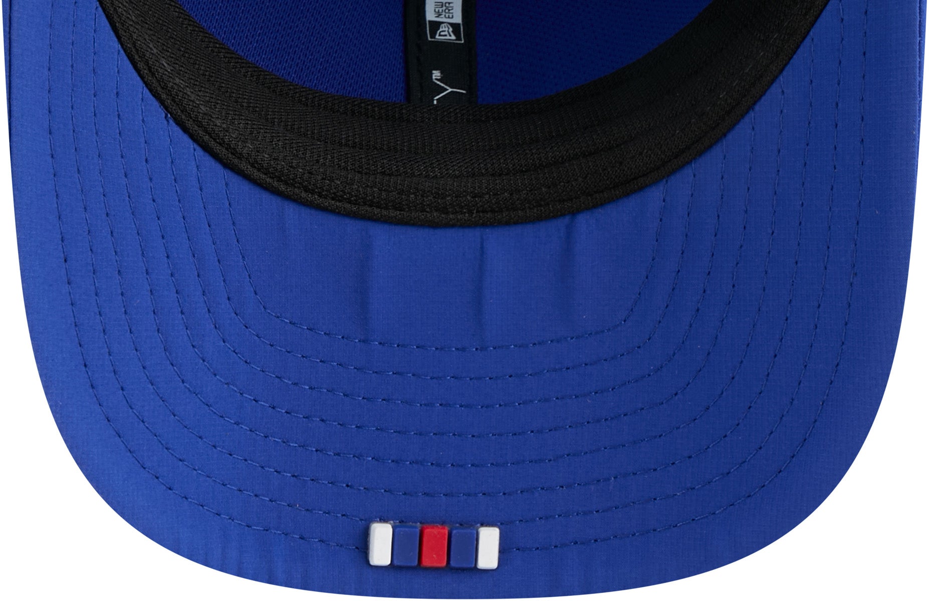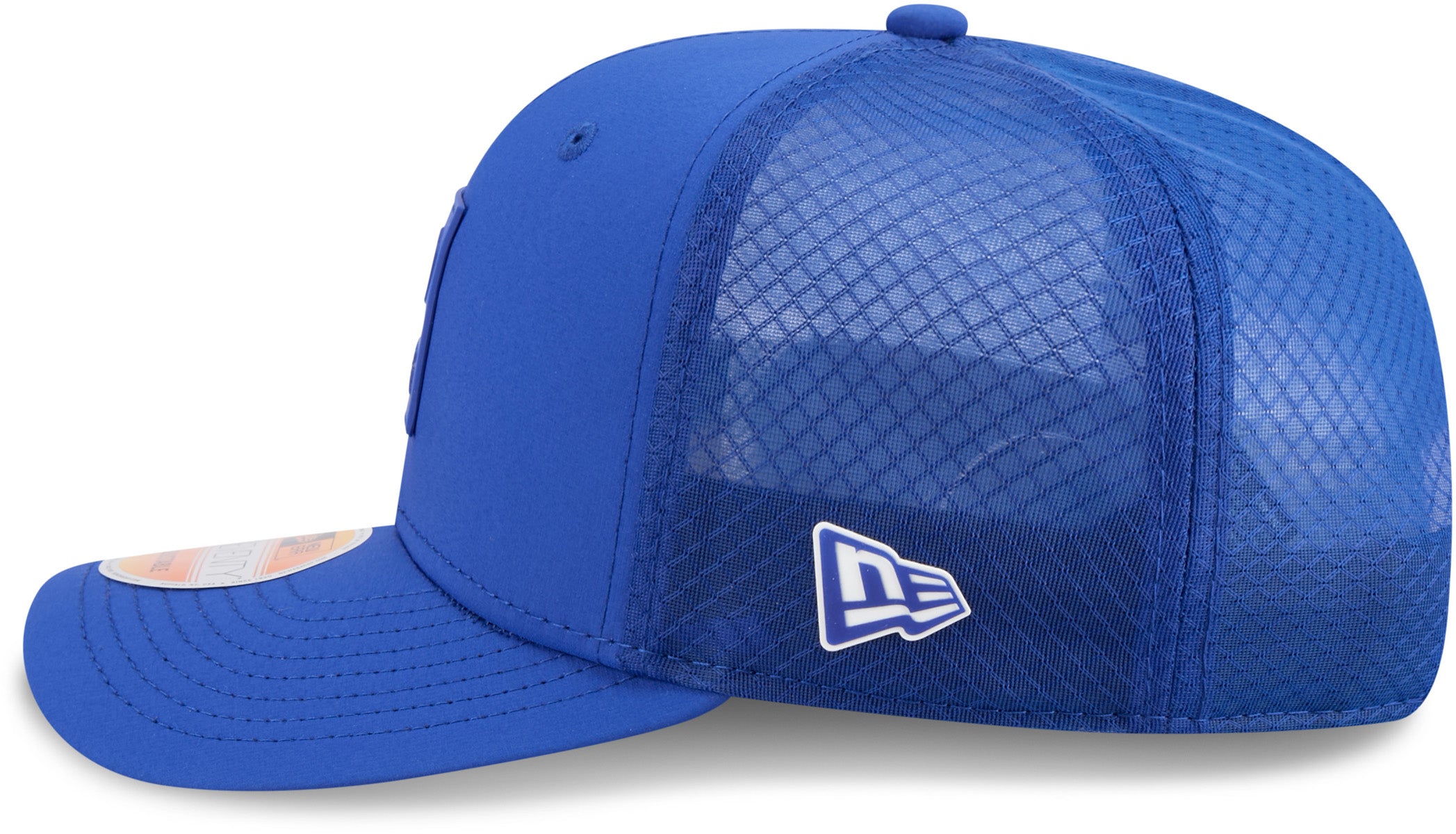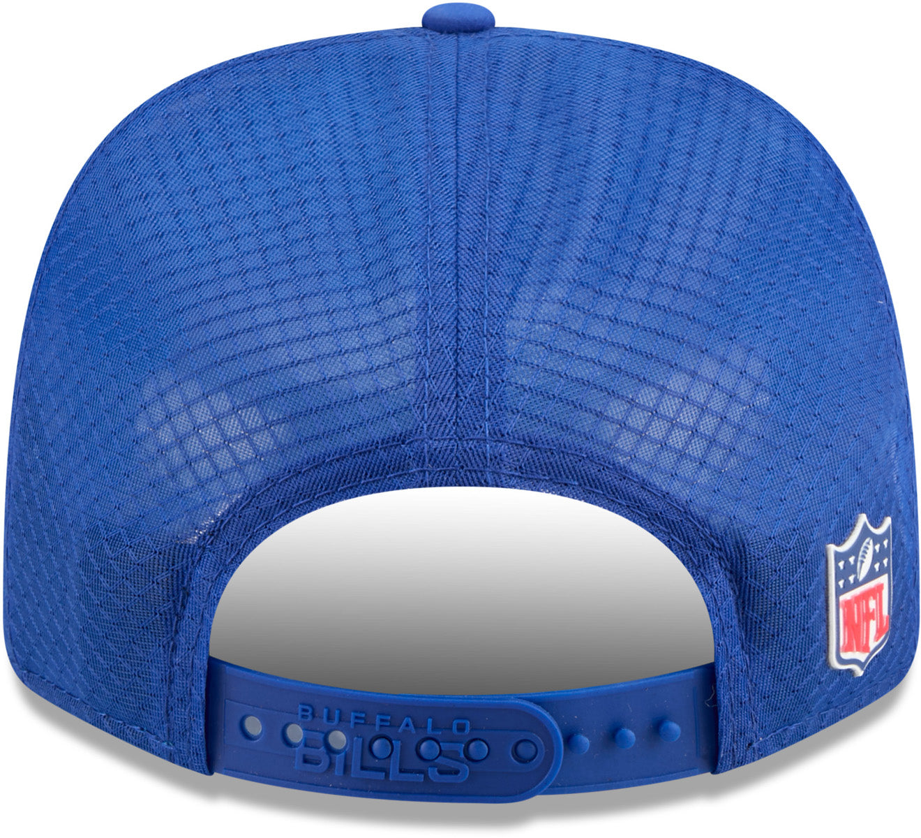 • Blue, with the Buffalo Bills front patch logo, the New Era flag side logo, and NFL rear logo, on the Mesh Backing, and the Team colour stripes on the underside of the Visor.
