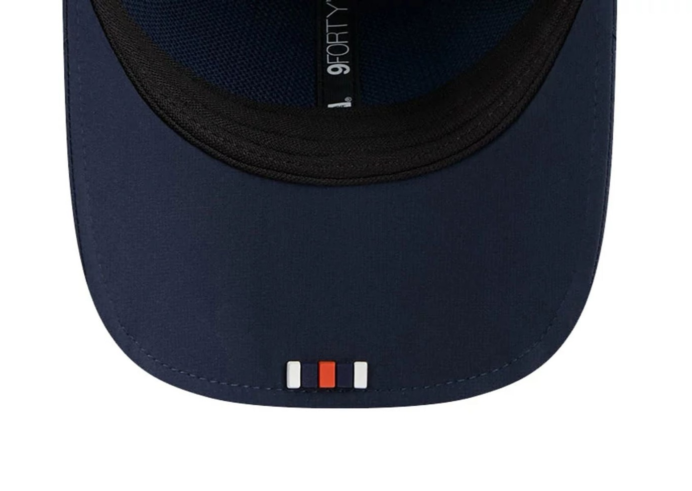 Chicago Bears NFL Sideline 2025 New Era 9Seventy Stretch Snapback Cap Structured Crown, with the Pre Curved Visor. Navy Blue, with the Chicago Bears front patch logo, the New Era flag side logo, and NFL rear logo, on the Mesh Backing, and the Team colour stripes on the underside of the Visor. Adjustable rear Snapback strap, with the embossed T...