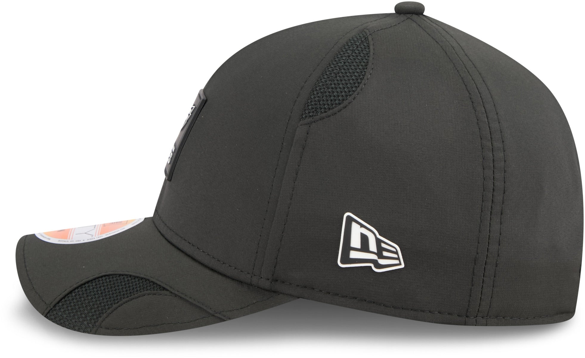 Las Vegas Raiders NFL Sideline 2025 New Era 9Seventy Stretch Snapback Cap Structured Crown, with the Pre-Curved Visor. Black, with the Las Vegas Raiders front patch logo, the New Era flag side logo, and NFL rear logo, on the Mesh Backing, and the Team colour stripes on the underside of the Visor. Adjustable rear Snapback strap, with the emboss...