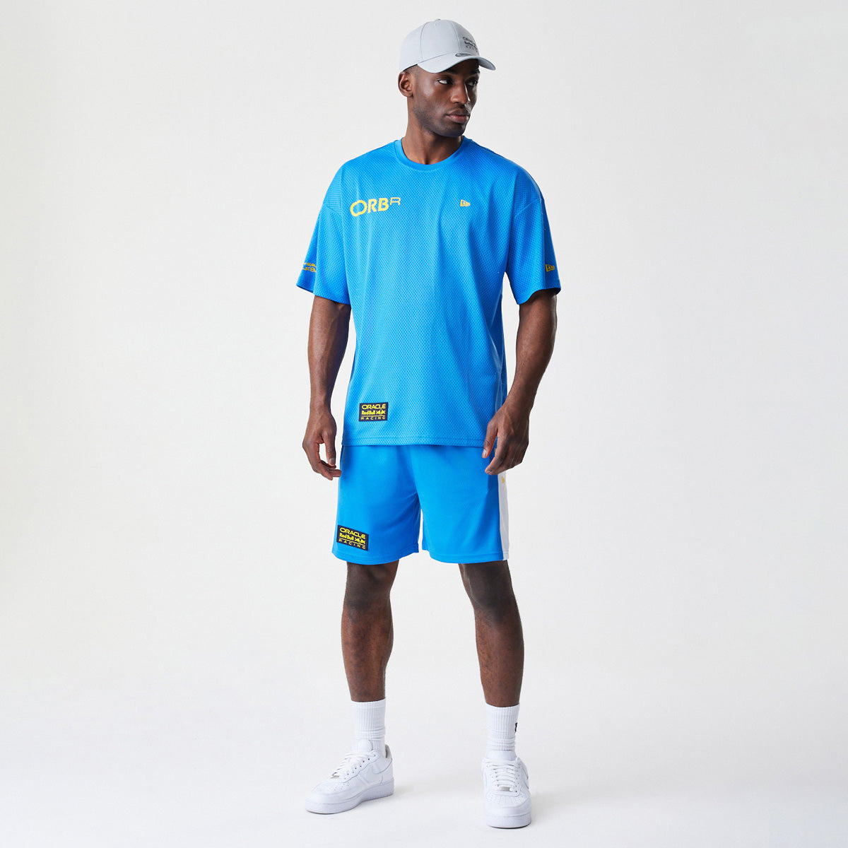 Red Bull Racing New Era Graphic Mesh Blue Shorts. Official Red Bull Racing Apparel. Drawstring waist closure. Blue Mesh Fabric, with the White side stripes, and the Oracle Red Bull Racing and New Era Flag logo's. The item is available in 4 different sizes, please see the size guide image for size details.