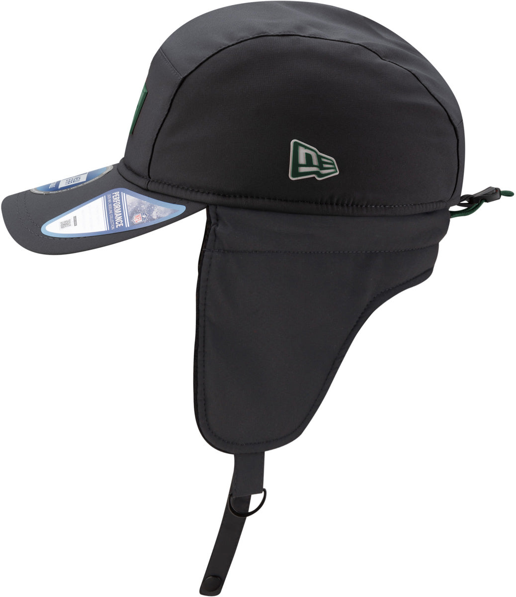 Jacksonville Jaguars New Era Sideline 2025 Cold Weather Runner Dog Ear Adjustable Cap. Official Sideline NFL Team merchandise. Black wipe clean fabric, the Stitch detail front panel, with the Rubberized Jacksonville Jaguars front logo, the New Era flag side logo, the NFL rear logo, and the adjustable rear toggle. The cap is fully fur lined, ...